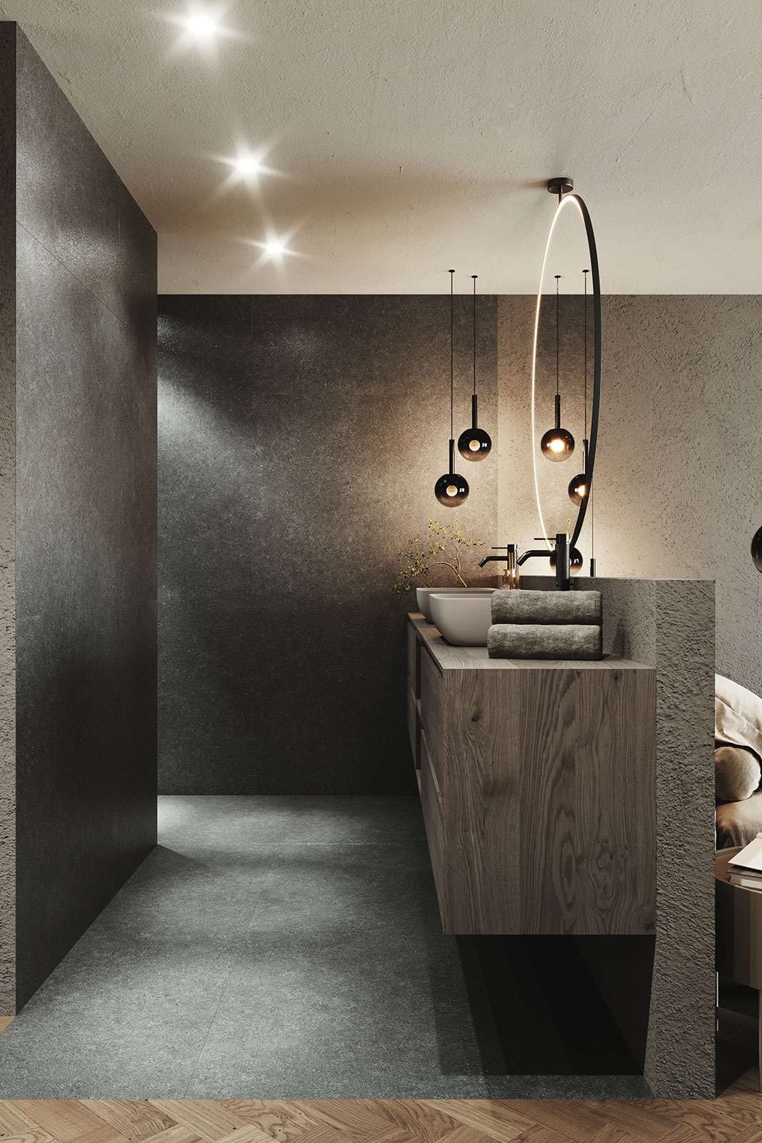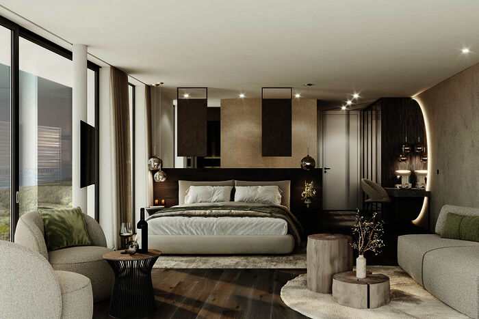Fein abgestimmte Stoffe, hochwertige Oberflächen und stilvolle Details verleihen dem Zimmer seinen eleganten, zeitgemäßen Charakter. Jede Linie, jedes Material und jede Textur ist bewusst gewählt, um ein Gefühl von Ruhe und modernem Komfort zu vermitteln.