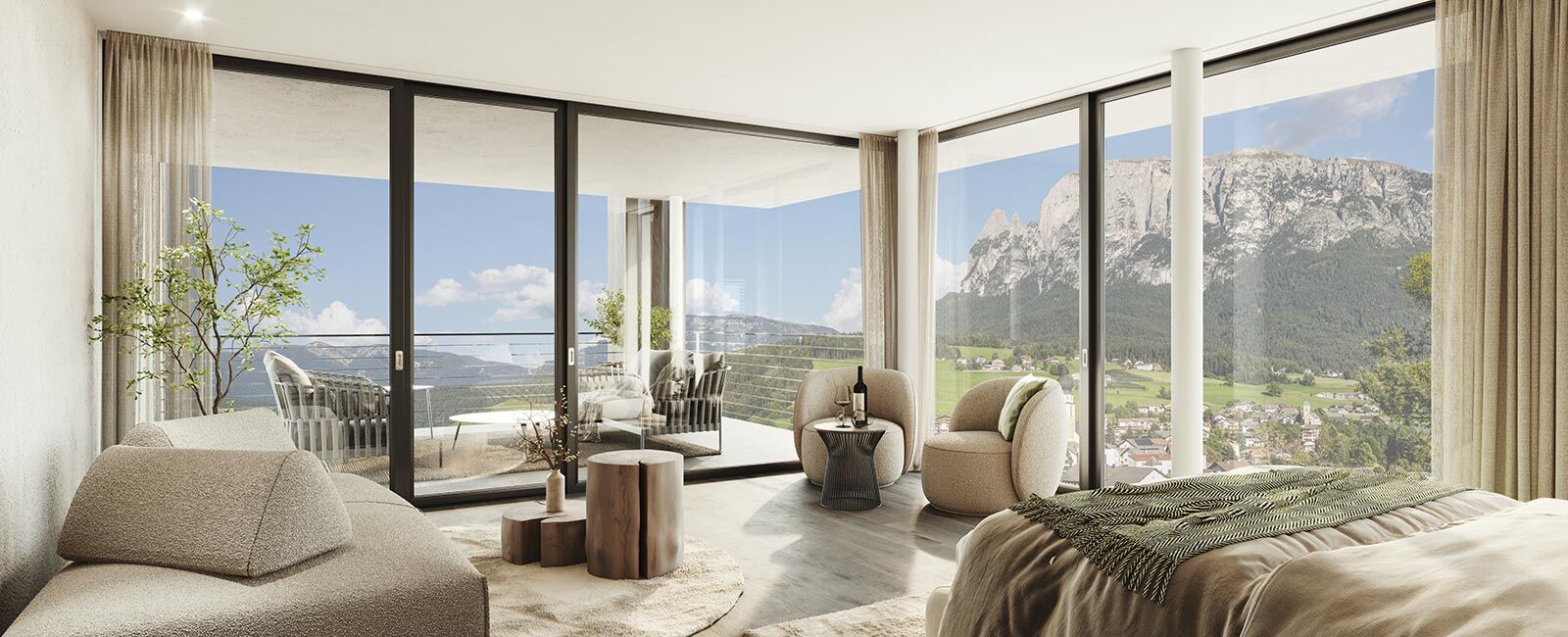 Die Fie Suite Dolomites Spa definiert exklusives Wohnen neu. Ein separates Schlafzimmer und ein stilvoller Wohnbereich schaffen ein offenes, fließendes Raumgefühl voller Leichtigkeit und Eleganz.